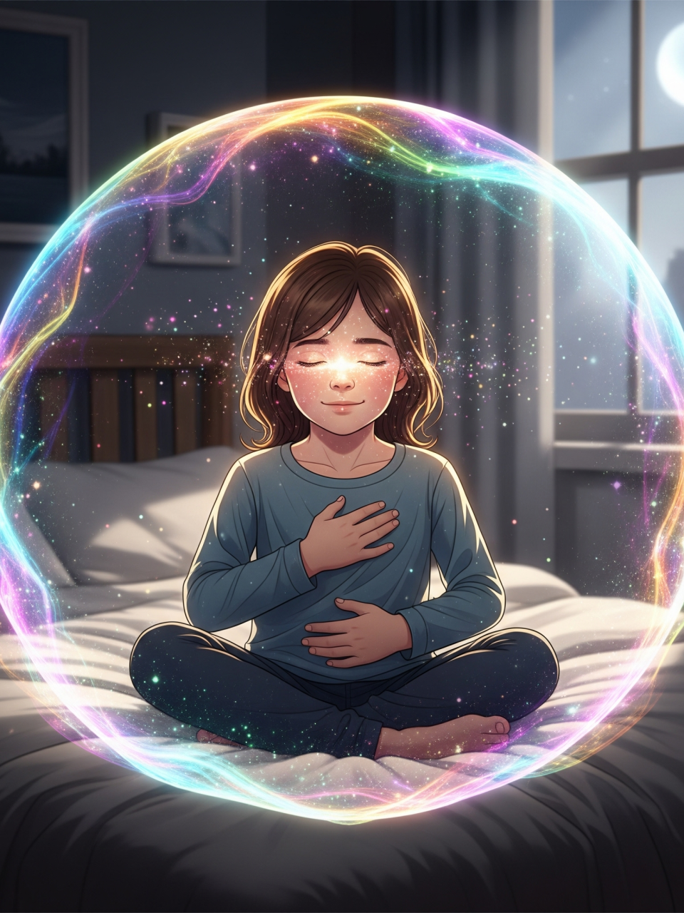 - Create an Energetic Bubble: When your child is in bed, have them place their hands on their belly and heart. Guide them through a quick meditation: “Imagine a beautiful golden light forming all around you. See it create a strong, sparkling bubble that surrounds your whole body and your bed. Tell your bubble to stay there all night, keeping you safe and sound.” This teaches them to manage their own energy and feel a sense of control. Dark entities that feed on fear are drawn to that same low frequency. Calling on high-frequency colors helps repel them. You can encourage your child to use different colors for their bubble based on what they need: